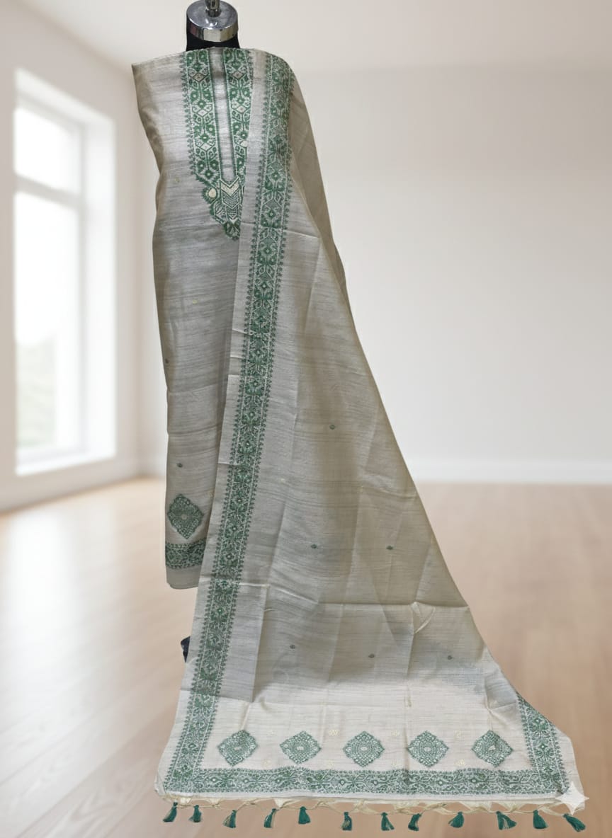 Beige colour unstitched tussar silk suit with green colour thread weaving